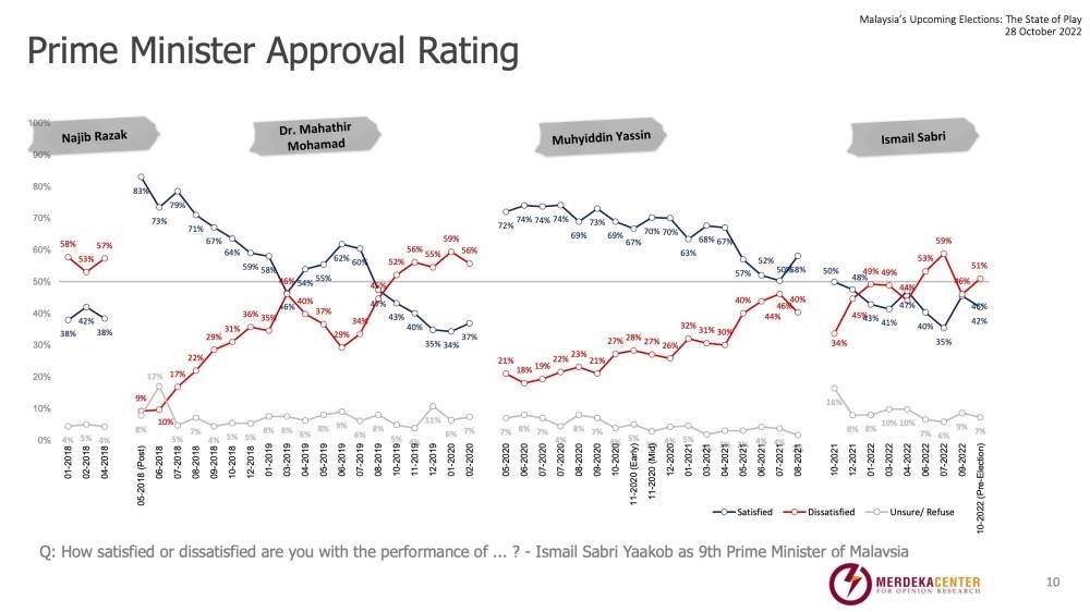 Caretaker prime minister Datuk Seri Ismail Sabri Yaakob also saw his approval rating falling from 42 per cent to 40 per cent. In comparison, his highest approval rating was 50 per cent when he came into power.