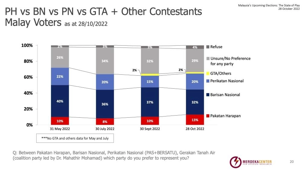 www.malaymail.com | KUALA LUMPUR, Nov 4 — A survey conducted by independent pollster Merdeka Center has found that Malay voters who are inclined to vote for Pakatan Harapan (PH) in the 15th general election (GE15) rose to 13 per cent on October 28 from 10 per cent back on May 31.